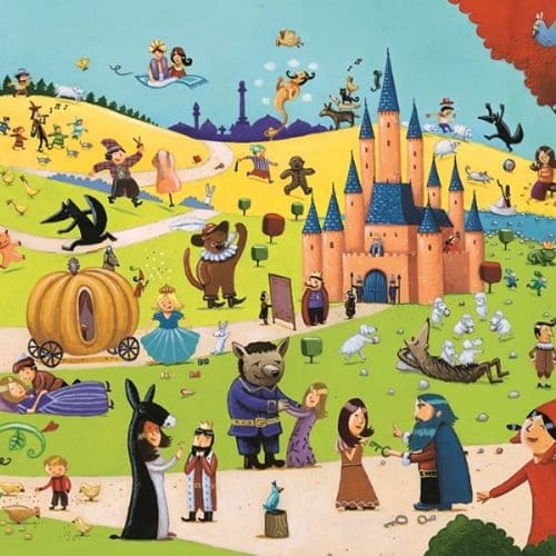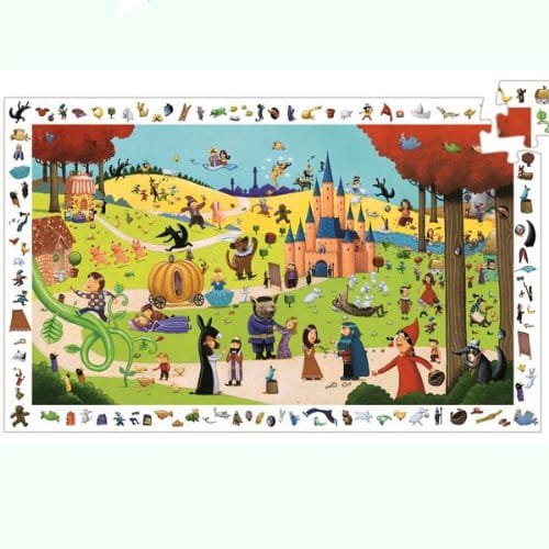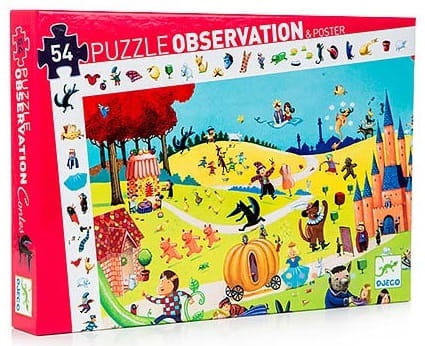 Bajkowe puzzle z serii Puzzle Obserwacja francuskiej marki DJECO przedstawiają sceny z różnych znanych bajek i baśni. Układanka, składająca się z 54 elementów, przedstawia zebranych bohaterów popularnych bajek. I tak oto znajdziemy tutaj m.in. zaczarowanie Kopciuszka, Kota w butach, tańczycych Piękną i Bestię, wspinającego się na fasolę Jasia, karmiącą smakołykami Jasia i Małgosię Babę Jagę, szyjącego Szewczyka Dratewkę, czy Alladyna i Jasmin na latającym dywanie. Kolorowy obrazek ciekawą kreską przedstawia wesołe scenki z mnóstwem różnych bohaterów, zwierząt i ciekawych przedmiotów, a naokoło w białej ramce rozrysowane są wszystkie rzeczy z rozgrywających się scen, dzięki czemu można bawić się z maluchem w ich znajdywanie na obrazku. Aby urozmaicić zabawę można zagrać kto w ciągu 2 minut znajdzie najwięcej przedmiotów lub bohaterów bajek na ułożonym obrazku. Te bajkowe puzzle wykonane zostały z grubej i bardzo wytrzymałej tektury i zapakowane w eleganckie, kolorowe pudełko.