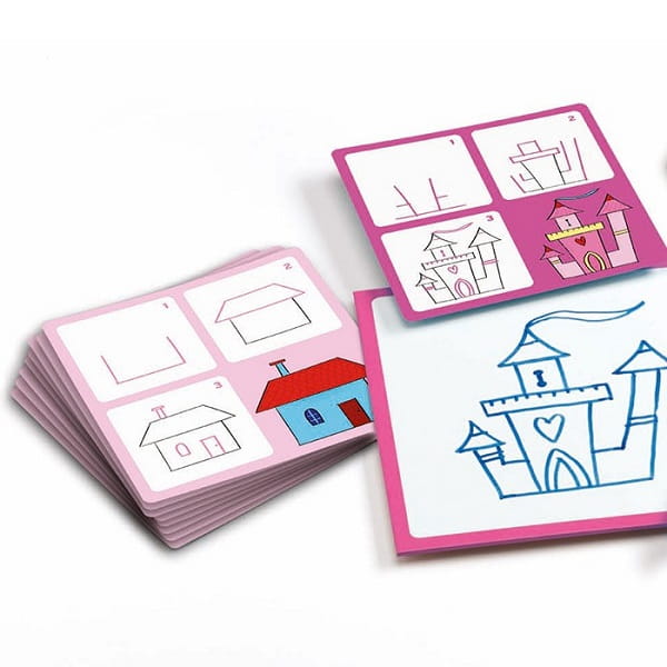 znajdziemy 12 kart z 24 wzorami, z których dziecko może brać przykład, dorysowując po kolei poszczególne elementy obrazka, białą planszę wielokrotnego użytku, na której można samodzielnie wykonać dany rysunek, mazak oraz ściereczkę. Dziecko naśladując wzór na karcie przedstawiające postacie księżniczek uczy się rysować. Całość została zapakowana w solidne tekturowe pudełko. Zestaw "Josephine" będzie idealny dla dziewczynek.