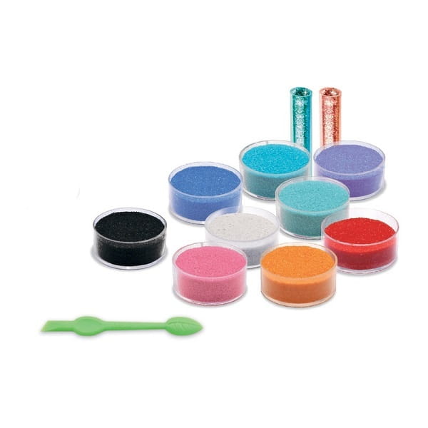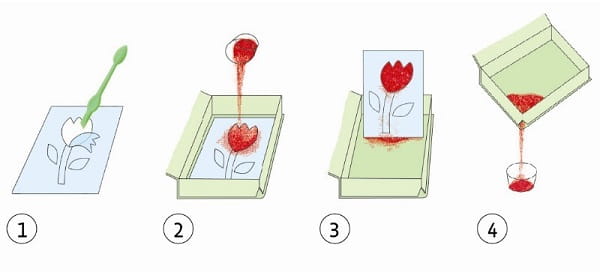 Zestaw od marki DJECO kryje w sobie mnóstwo plastycznej zabawy dla małych artystów. Zestaw "Tęczowe rybki " zawiera 4 tablice tekturowe z naszkicowanym rysunkiem, każdy element jest ponumerowany i pokryty klejem zabezpieczonym taśmą przezroczystą. Dziecko odrywa fragment "naklejki" i posypuje kolorowym piaskiem lub brokatem. Piasek przykleja się a jego nadmiar zsypujemy z powrotem do pojemniczka i odklejamy następny kawałek az powstanie cały obrazek. Do podważania naklejki służy specjalny patyczek, dołączony do zestawu. Dzięki pomysłowym rozwiązaniom (piasek sypiemy nad tekturowym pudełkiem z otworkiem na roku) bałagan będzie minimalny, a końcowy efekt zachwycający.
