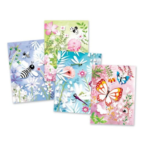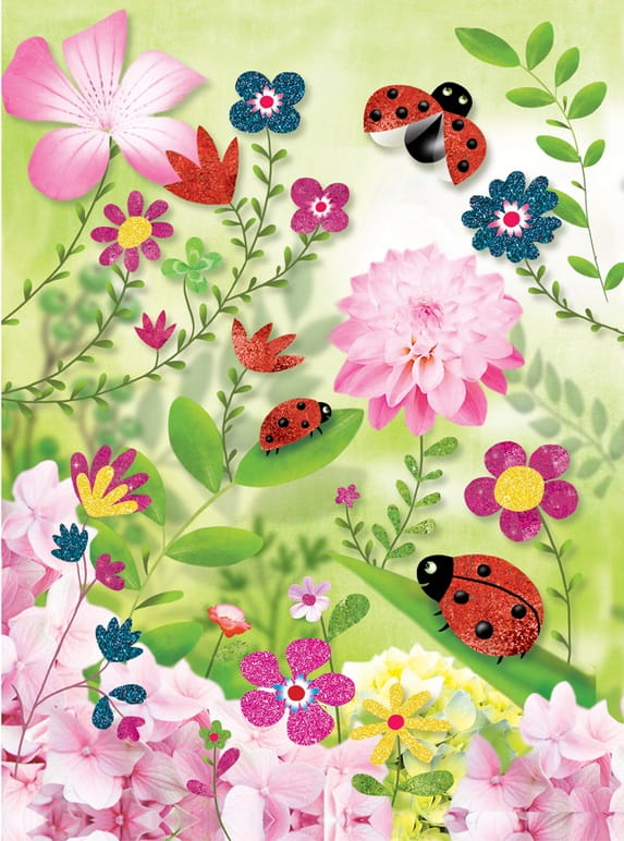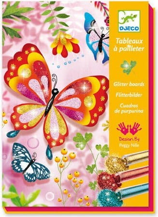 Zestaw od marki DJECO kryje w sobie mnóstwo plastycznej zabawy dla małych artystów Komplet zawiera 4 tekturowe karty z owadami, 6 tubek brokatu, aplikator do odrywania naklejek i pędzelek. Tematem przewodnim zestawu są piękne latające owady w otoczeniu kwiatów i zieleni. Wśród nich znajdziemy motyle, ważki, biedronki i pszczoły. Każda tablica z naszkicowanym rysunkiem posiada elementy podklejone klejem i zabezpieczone taśmą przezroczystą. Dziecko odrywa fragment naklejki i wysypuje kolorowym brokatem. Wystarczy przystroić wybrane elementy obrazka, aby lśniły pięknym blaskiem! Utworzone dzieła sztuki mogą stać się później oryginalną ozdobą dziecięcego pokoju, która zachwyci kolegów i rodzinę.