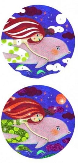 Zestaw od marki DJECO kryje w sobie mnóstwo plastycznej zabawy dla małych artystek! Komplet zawiera 4 tekturowe karty z postaciami syren, 6 tubek brokatu, aplikator do odrywania naklejek i pędzelek. Tematem przewodnim zestawu są magiczne syreny pływające w morskich głębinach. Każda tablica z naszkicowanym rysunkiem posiada elementy podklejone klejem i zabezpieczone taśmą przezroczystą. Dziecko odrywa fragment naklejki i wysypuje kolorowym brokatem. Wystarczy przystroić syrenę i morską faunę i florę brokatem, aby lśniły pięknym blaskiem! Utworzone dzieła sztuki mogą stać się później oryginalną ozdobą dziecięcego pokoju.
