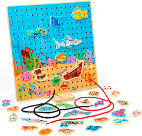 Gotowi na podwodną przygodę? Przewlecz sznurówki przez kolorowe kształty i umieść je na tablicy tworząc ekscytującą scenę morską. Drewniane zabawki do nawlekania to świetny sposób na rozwijania koordynacji wzrokowo-ruchowej, zręczności i sprawności manualnej rąk.