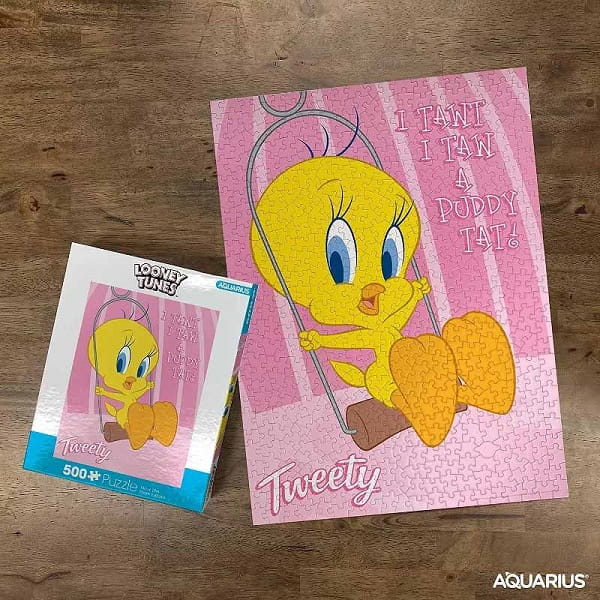 Tweety to jeden z głównych bohaterów serii Zwariowane Melodie - jest żółtym kanarkiem, który odbywa wiele zabawnych przygód wspólnie ze swoim towarzyszem, kotem Sylwestrem. Puzzle Aquarius składają się z 500 elementów i umożliwiają złożenie obrazka o wymiarach 35 cm x 48 cm. Układanka przedstawia oczywiście Tweety'ego na różowym tle, który radośnie buja się na huśtawce.