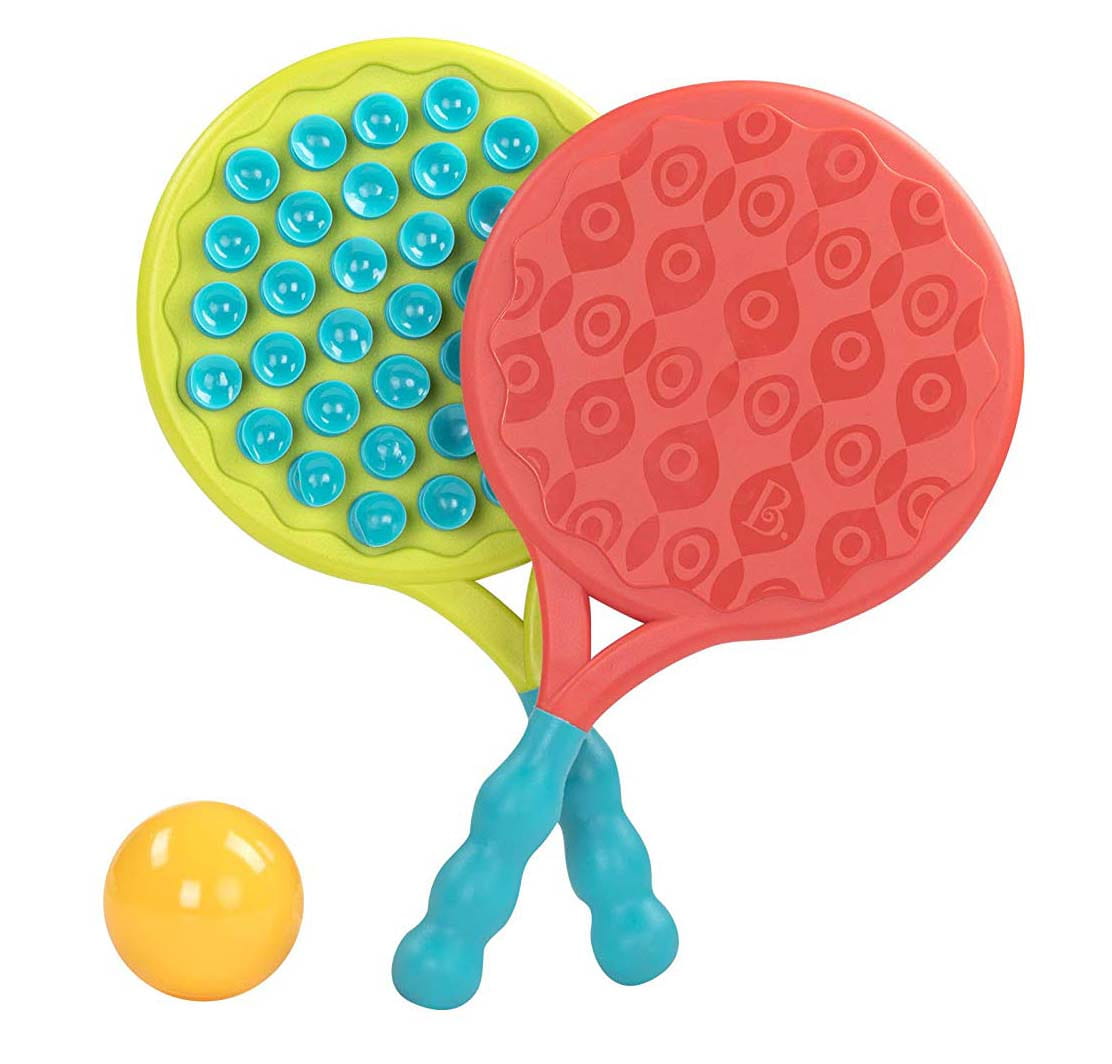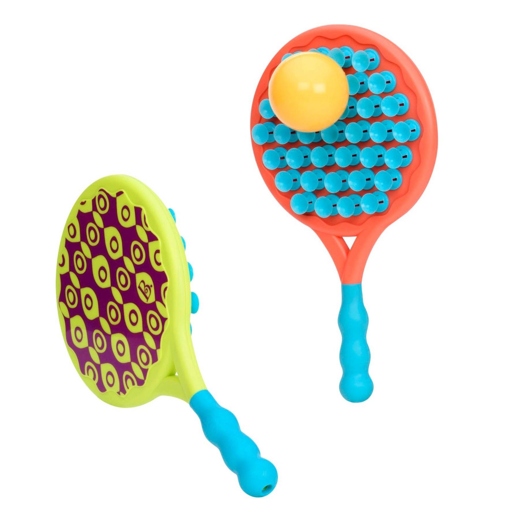 Zestaw dwustronnych rakietek z piłeczką od firmy B.Toys, który świetnie sprawdzi się podczas zabaw na świeżym powietrzu. Rakietki zostały wyposażone w dwie różne strony - pierwsza, gładka do klasycznego odbijania, a druga wyposażona w specjalne przyssawki do łapania piłeczki. Zabawka nadaje się dla dzieci powyżej trzeciego roku życia i stanowi nową odsłonę dla standardowej wersji popularnej gry.