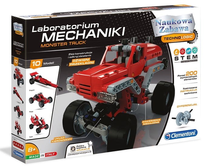 Zbuduj swojego Monster Trucka i na własne oczy przekonaj się o działaniu wszystkich jego mechanizmów! Zestaw z serii Laboratorium Mechaniki włoskiej marki Clementoni zawiera aż 200 wymiennych elementów, z jakich do złożenia jest potężny pojazd typu monster truck w czerwonym kolorze. Auto ma wysokie zawieszenie i ogromne koła, które umożliwiają poruszanie się po najbardziej grząskim terenie - jesteś gotowy, by poznać wszystkie mechanizmy usprawniające działanie tego drogowego potwora?