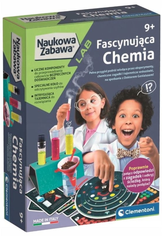 Fascynująca Chemia marki Clementoni sprawdzi się dla początkujących dzieciaków, które zaciekawione oddziaływaniem na siebie poszczególnych substancji będą mogły samodzielnie sprawdzić, jakie efekty dają poszczególne doświadczenia chemiczne.