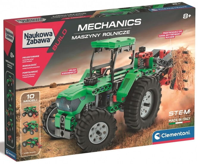 Zestaw konstrukcyjny Maszyny rolnicze marki Clementoni powstał w oparciu o technologię STEM, która wspiera rozwój zainteresowania naukami ścisłymi. Zestaw dedykowany jest dzieciom powyżej 8. roku życia.