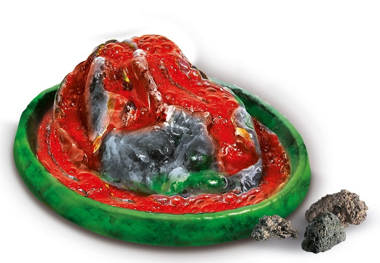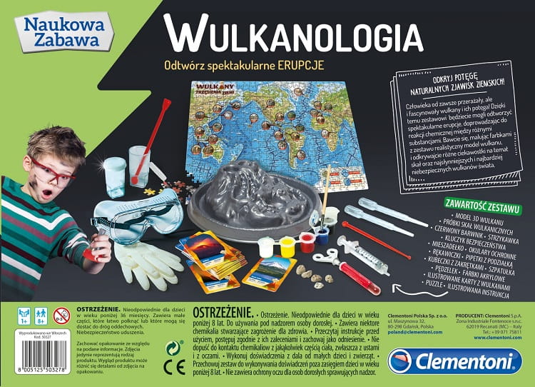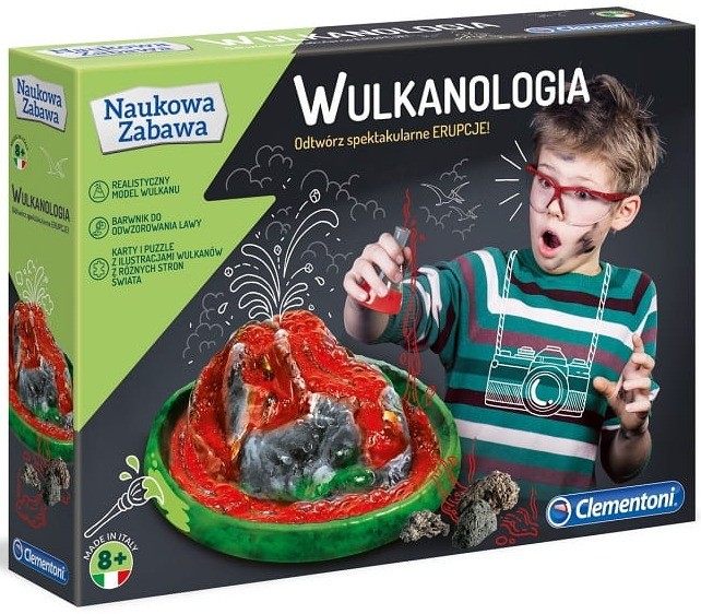 Wulkany od zawsze fascynowały naukowców, którzy próbowali rozpracować mechanizmy rządzące tymi niebywałymi siłami natury. Erupcje potężnych wzniesień często powodowały nie lada zniszczenia, nad którymi nikt w żaden sposób nie mógł zapanować. Zestaw naukowy marki Clementoni pozwala na odtworzenie wybuchu wulkanu w warunkach domowych przy zachowaniu wszelkich zasad bezpieczeństwa - maluchy mają do dyspozycji bardzo realistyczny model wulkanu, z którego może wydobywać się czerwona lawa. Wewnątrz opakowania znajdują się wszystkie niezbędne akcesoria prawdziwego naukowca jak okulary ochronne, rękawiczki, pipety, strzykawka, barwnik, mieszadełko czy próbki skał wulkanicznych, ale również ilustrowane karty z ciekawostkami i puzzle, na których znajduje się mapa z aktywnymi wulkanami.