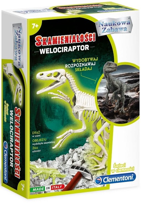 Welociraptor to zdecydowanie jeden z najpopularniejszych prehistorycznych gadów. Już teraz można samodzielnie odkopać jego szczątki, by później złożyć je w imponujący szkielet, który dodatkowo świeci w ciemności! Zestaw z serii Naukowa Zabawa zawiera blok ziemi, wewnątrz którego ukryto skamieliny welociraptora - aby je odkopać należy użyć dołączonego do zestawu dłutka i młotka. Czas pobawić się w paleontologa, przenieść się w przeszłość i odkryć to, co do tej pory można było zobaczyć tylko podczas muzealnych wystaw.