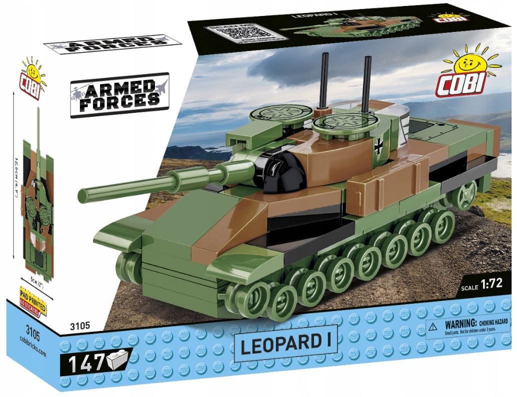 Leopard I to podstawowy czołg bojowy drugiej generacji opracowany w Niemczech w latach 60 XX wieku. Czołg ten służył w Bundeswehrze i wielu innych armiach NATO i stał się symbolem niemieckiej potęgi pancernej, obecniej można go jeszcze spotkać w niektórych armiach. Model Mini wykonany z klocków COBI zaprojektowany jest w skali 1: 72 i składa się ze 147 wysokiej jakości elementów. Pomimo niewielkich rozmiarów zachowuje wszystkie ważne cechy modelu historycznego. Wieża czołgu jest ruchoma i można ją obracać., a beczka porusza się w górę i w dół.