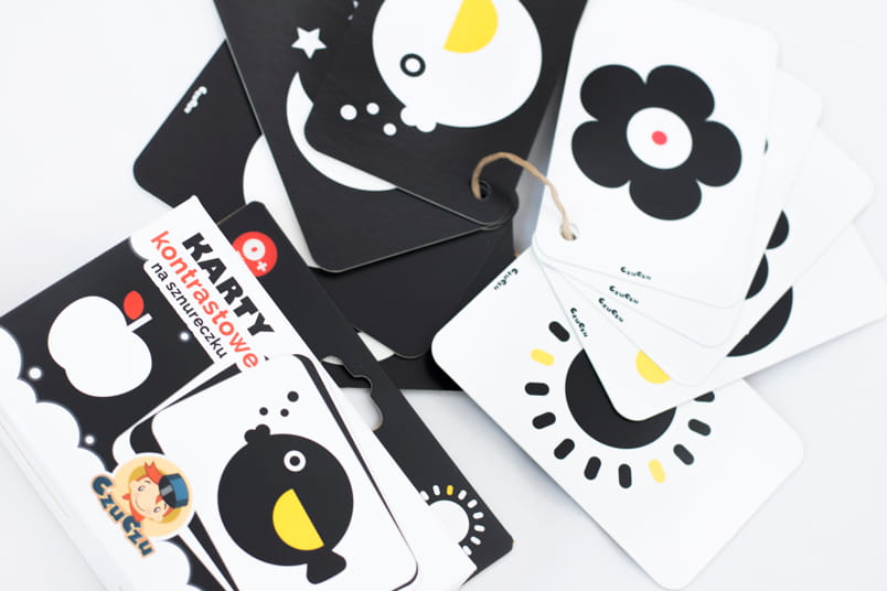Nigdy nie jest za wcześnie na odkrywanie świata! Ten zestaw kart kontrastowych od CzuCzu jest rekomendowany już od pierwszych dni życia. W zestawie znajduje się 10 dwustronnych kart na sznureczku. Każda z nich przedstawia bardzo prosty, schematyczny rysunek w kontrastowych kolorach - głównie bieli i czerni. Powolutku zostają wprowadzone dwa kolory - żółty i czerwony. Ilustracje przedstawiają słońce, księżyc, jabłko, rybkę, kwiatka, głowę misia, chmurę z deszczem i drzewo. Każda z nich jest schematyczna i ogólna - nie zawiera szczegółów i detali.