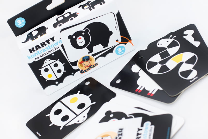 Jednym ze sposobów edukacji niemowlaków są karty kontrastowe. Zabawa, podczas której dziecko uczy się otaczającego go świata, opiera się na obserwacji ilustracji. W zestawie znajduje się 10 obrazków w czarnym i białym kolorze, z których kilka posiada drobne, kolorowe elementy (żółte i czerwone). Ilustracje są schematyczne. Przedstawiają zwierzątka takie jak misie, pieski, słonie, wieloryby i węże oraz domki z ogrodem i samochody.