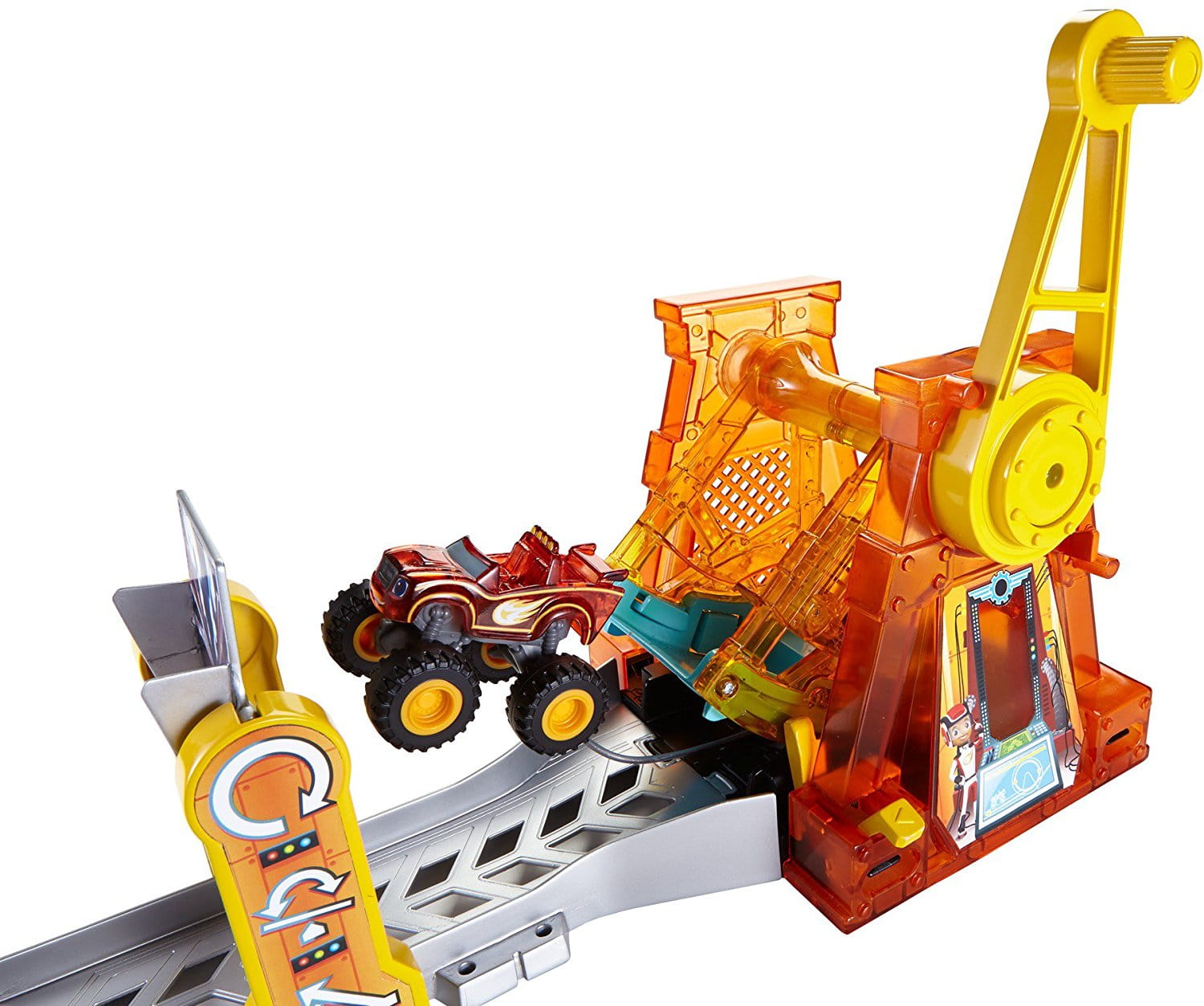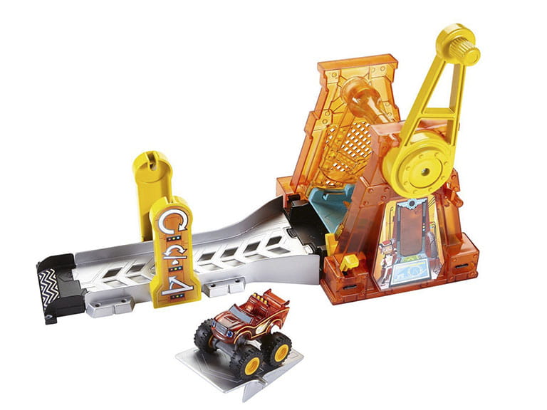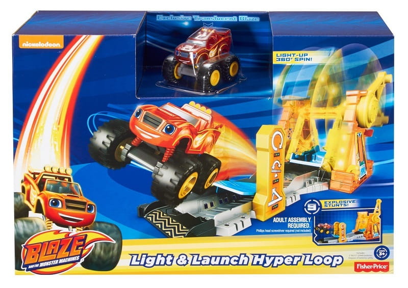 Czerwony monster truck Blaze to niesamowity pojazd. Dzięki specjalnej budowie i wielkim kołom, świetnie radzi sobie w trudnym terenie. Uwielbia też eksperymentować i próbować swoich sił podczas kaskaderskich akrobacji. W zestawie z serii Blaze od firmy Fisher Price znajdziemy podświetlany tor z super wyrzutnią oraz półprzeźroczyste autko Blaze. Pojazd należy umieścić w wyrzutni, przekręcić korbką nadając mu prędkość i nacisnąć przycisk zwalniający pętle. Blaze wykona obrót o 360 stopni i niczym z procy wystrzeli do przodu! Można również dodać wyskok do toru i ćwiczyć kaskaderskie manewry. Długość jazdy i zakres wyskoku samochodziku można regulować poprzez różne ustawienie podestu do wyskoku.