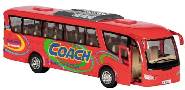 Model metalowego autobusu, który bardzo dokładnie oddaje wygląd prawdziwego pojazdu. Autobus w większości wykonany został z metalu, ma 4 ruchome, gumowe kółeczka ze srebrnymi felgami oraz napisy tematyczne i kolorowe nadruki na czerwonej karoserii. Przez transparentne okienka widać rzędy siedzeń wewnątrz pojazdu; przednie drzwi są otwierane.