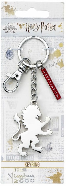 Brelok ze srebrnym symbolem domu Gryffindor - Lwem i czerwoną blaszką z napisem "Gryffindor" stanie się idealną ozdobą plecaka, piórnika czy torebki. Brelok posiada również specjalne zapięcie karabińczyk, dzięki czemu może być wpięty do wielu innych rzeczy. Rozmiar Lwa: 5 cm x 4 cm, długość blaszki z napisem: 3 cm, długość całkowita breloka: 15 cm.