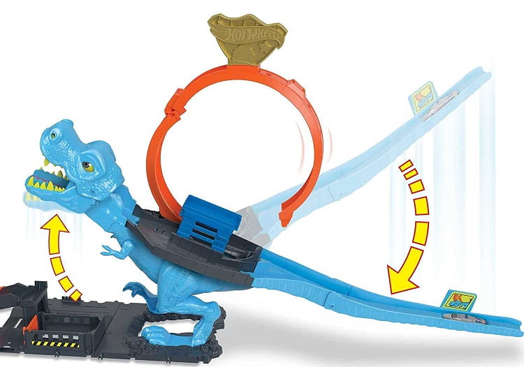 Nawet w centrum dużego miasta nie można czuć się bezpiecznie! Tym razem na wszystkich śmiałków czeka olbrzymi T-Rex, który już ostrzy sobie zęby na każdego, kto zdecyduje się przejechać przez jego trasę. Zestaw z serii Hot Wheels City z powodzeniem posłuży do samodzielnej zabawy, ale stanie się również ciekawym uzupełnieniem większych propozycji - przejazd składa się bowiem z wyrzutni, która napędzi autko, znajdujące się na starcie, a także z olbrzymiej figurki niebieskiego T-Rexa, z jakiej wyłania się wielka pętla! Każdy samochodzik musi wjechać do paszczy tej groźnej bestii, by skończyć przejazd na ogonie dinozaura - zadanie to nie jest jednak wcale takie proste, ponieważ figurka jest ruchoma i T-Rex w każdej chwili może zmienić swoje położenie. Jesteś gotowy, by dołączyć do wspólnej zabawy?