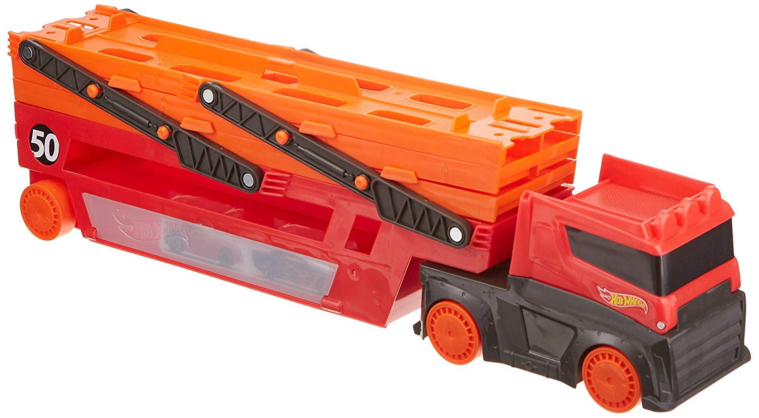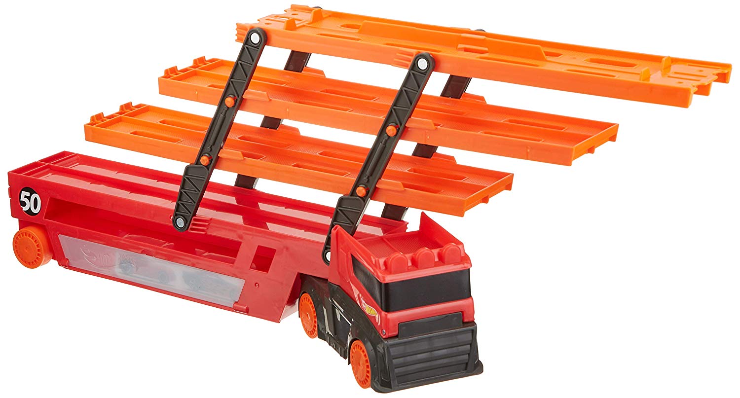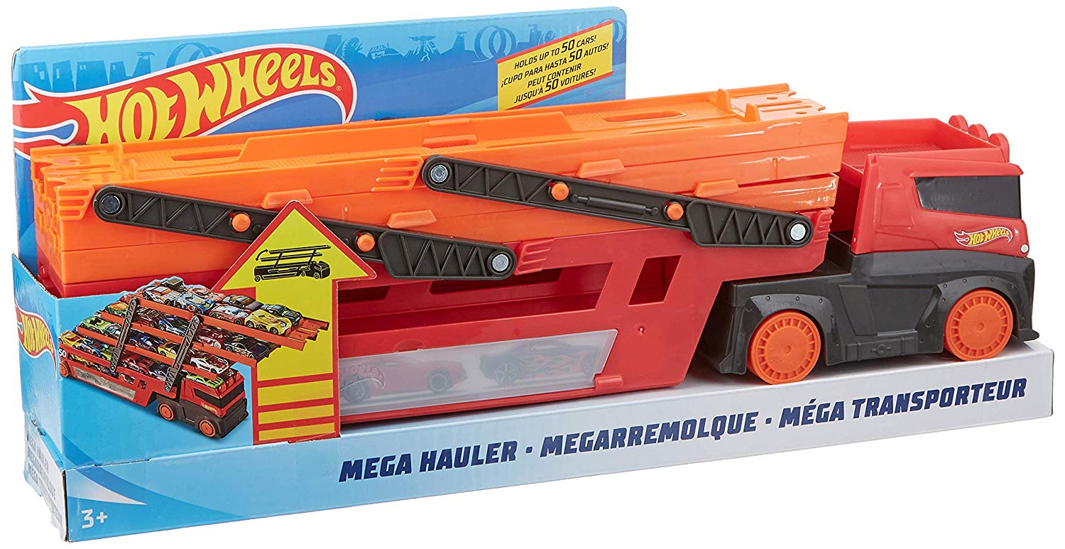 Już jest! Nowy, wielki Mega Transporter Hot Wheels w czerwono-pomarańczowej kolorystyce. Ogromny pojazd od marki Mattel gwarantuje dwa sposoby zabawy. Wielką pakę rozłożymy wykonując jedynie prosty ruch, tworząc tym samym miejsce „parkingowe” (na sześciu poziomach!) dla pięćdziesięciu małych samochodzików Hot Wheels, wyprodukowanych w skali 1:64. Dodatkowe, specjalne miejsce dla naszych ulubionych modeli znajdziemy także wewnątrz podwozia ciężarówki, za przezroczystą, otwieraną klapką oraz odchylając tylną kabinę. Mega Transporter możemy połączyć z innymi zestawami z serii.