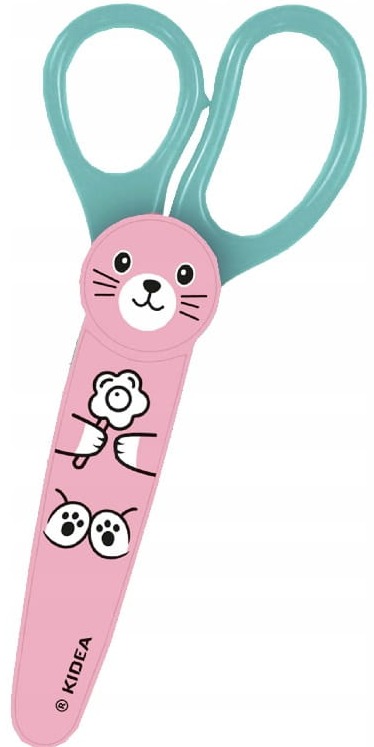 Nożyczki marki Kidea wykonane zostały ze stali nierdzewnej. Ich zaokrąglone końcówki zapobiegną przed skaleczeniem się. Nożyczki wsunąć można do plastikowego etui na ostrze, ozdobionego wizerunkiem uroczego, różowego króliczka. Wygodne rączki zapewnią komfortowe użytkowanie.