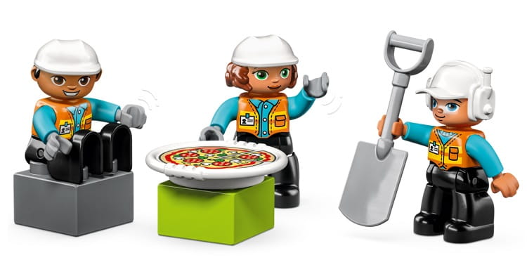 Plac budowy to wyjątkowo interesujące miejsce, które ciekawi wszystkie maluchy - mogą bowiem sprawdzać tutaj, jak w rzeczywistości działają wszystkie maszyny! Zestaw klocków LEGO® DUPLO® stanie się wspaniałym pomysłem na prezent dla wszystkich najmłodszych konstruktorów - do zbudowania jest wysoki żuraw z kabiną kierowcy i ruchomym wysięgnikiem, buldożer z łyżką, a także betoniarka z migającymi światełkami na dachu i efektami dźwiękowymi! Każdy z elementów zestawu można wykorzystać do transportowania różnych materiałów budowalnych, szczególnie że żuraw ułatwi przeniesienie wielkiego głazu, zaś buldożer sprawnie przeniesie mniejsze i bardziej sypkie materiały. Wszystkie pojazdy są wyjątkowo kolorowe, a za ich sterami miejsce znajdują wykwalifikowani pracownicy. Czas na przerwę! Gorąca pizza już na was czeka!