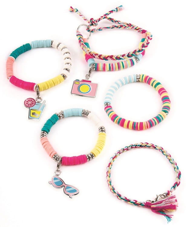 Ten zestaw akcesoriów i półfabrykatów do wyrobu własnej biżuterii z pewnością ucieszy każdą kreatywną dziewczynkę. Zawiera on elementy niezbędne do samodzielnego wykonania wspaniałych ozdób - koraliki, sznureczki czy kółeczka montażowe, a także barwne zawieszki. Zawarte w zestawie elementy wystarczą na stworzenie aż pięciu bransoletek!