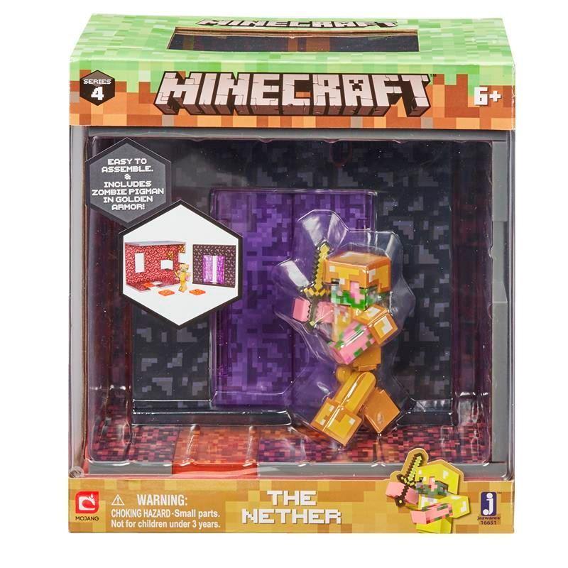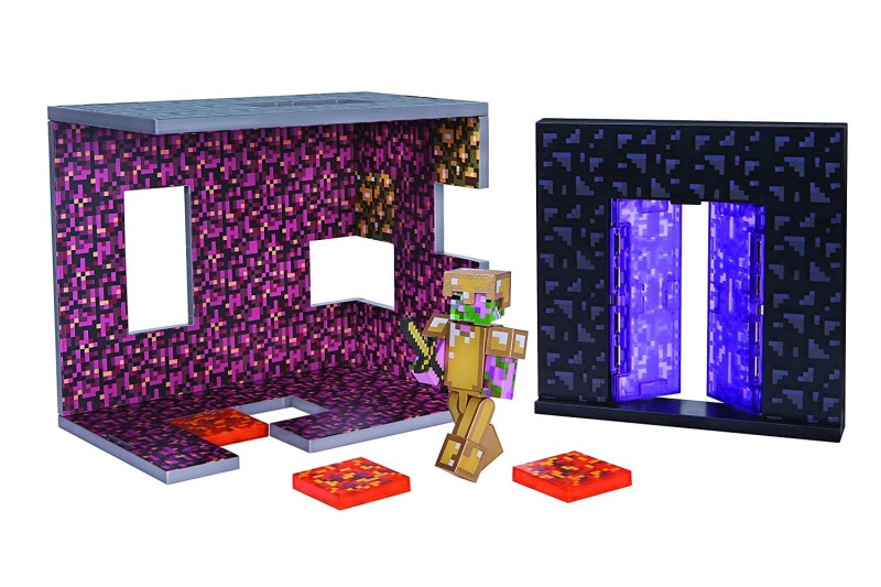 To zestaw dla prawdziwego fana gry komputerowej Minecraft! Zawiera dwie ściany, w tym jedną z portalem, klocki lawy i figurkę Zombie Pigmana w złotej zbroi. Kolor ścian odpowiada materiałom, z których w świecie gry zbudowany jest wymiar Netheru. Zestaw łatwo zmontować. Może służyć do zabawy w odgrywanie przygód ze świata Minecraft lub stanowić imponujący element fanowskiej kolekcji.