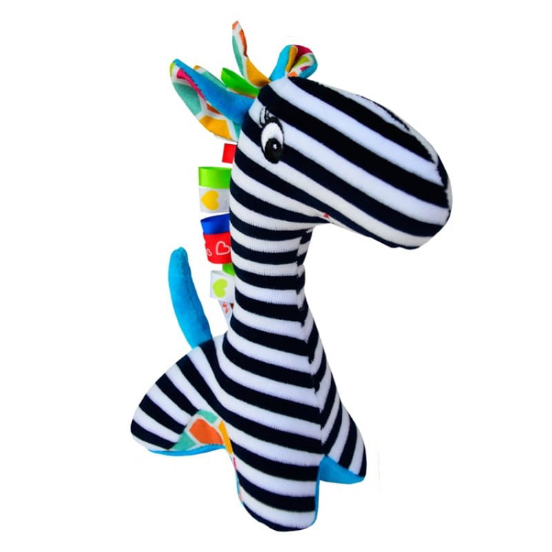 Dla chłopca i dla dziewczynki - żyrafa Tymek to neutralna maskotka, przeznaczona dla dzieci już od pierwszych dni życia. Sensoryczna przytulanka jest uszyta ręcznie z różnych materiałów, które różnią się fakturą i kolorystyką. Tymek ma biało - czarne paski, wyhaftowane oczko oraz niebieskie podbrzusze i ogon. Kolorowymi elementami są także uszka zwierzęta oraz grzywa, która dodatkowo jest wykonana z metek. W środku maskotki znajduje się grzechotka, która zachęci dziecko do zabawy z nową przytulanką.