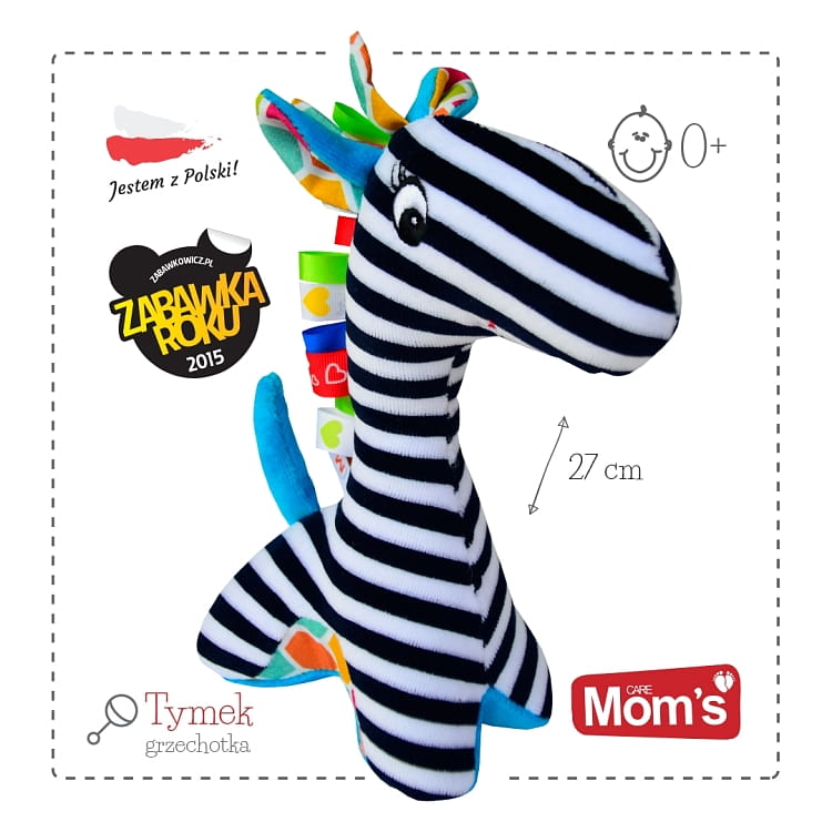 Zabawka z serii Mom;rsquo;s Care od firmy Hencz Toys jest wykonana ręcznie w Polsce. Cechuje się wysoką jakością użytych materiałów, jest w pełni bezpieczna dla maluchów i polecana już od pierwszych dni życia. Stymuluje zmysły, aktywizuje, zachęca do zabawy i do odkrywania świata. Wielką zaletą zabawki jest także jej lekkość - dzięki temu nie stanowi żadnego zagrożenia, nawet dla noworodka. Żyrafa Tymek to produkt typu hand-made (wytworzony ręcznie w Polsce). Dzięki metkom maluch rozwija spostrzegawczość i koncentrację. Szeleszczące elementy wpływają na koordynację wzrokowo - ruchową.