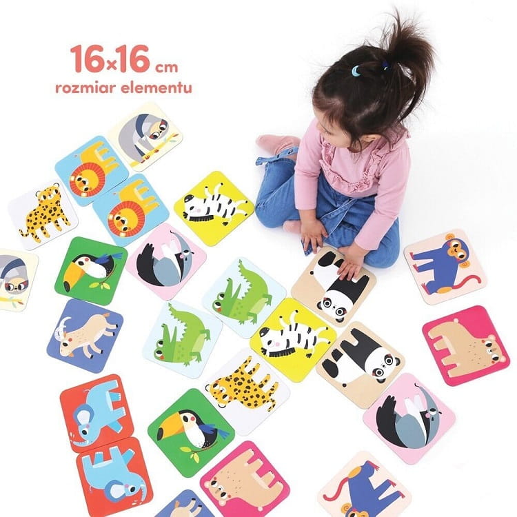 Półtoraroczne dziecko potrafi już w pewnym stopniu myśleć logicznie. Warto, by tę umiejętność rozwijać i pielęgnować. Kolorowe układanki to zabawa, która zajmuje na długo uwagę dziecka. Jest to atrakcyjne dla malucha zajęcia, podczas którego ćwiczy swoją pamięć, spostrzegawczość i logiczne myślenia. Puzzle z dziurką to kreatywna zabawa dla najmłodszych dzieci. W zestawie znajduje się 12 kart o wymiarach 16x16cm. Karty ilustrują zwierzątka. Wewnątrz każdego z puzzli znajduje się dziurka, a małe elementy przedstawiają zwierzaki – dzieci. Zadaniem smyka jest dopasowanie zwierzątka – dziecka do jego mamy. Rysunki są kolorowe, lecz schematyczne, a dzieci różnią się od rodziców jedynie kolorami. Na przykładzie puzzli dziecko nauczy się także nowych słów oraz poćwiczy rozróżnianie kolorów.