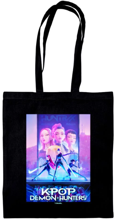 Torba inspirowana serialem K-Pop Demon Hunters to przydatne akcesorium, które sprawdzi się zarówno podczas zakupów, jak i wypraw na wycieczkę czy do szkoły. Wykonana została w 100% z bawełny; jest czarnego koloru i posiada nadruk głównych bohaterek w blasku neonowych świateł. Dzięki dłuższym uszom można wygodnie założyć ją na ramię. Torba pomieści książki i zeszyty formatu A4.