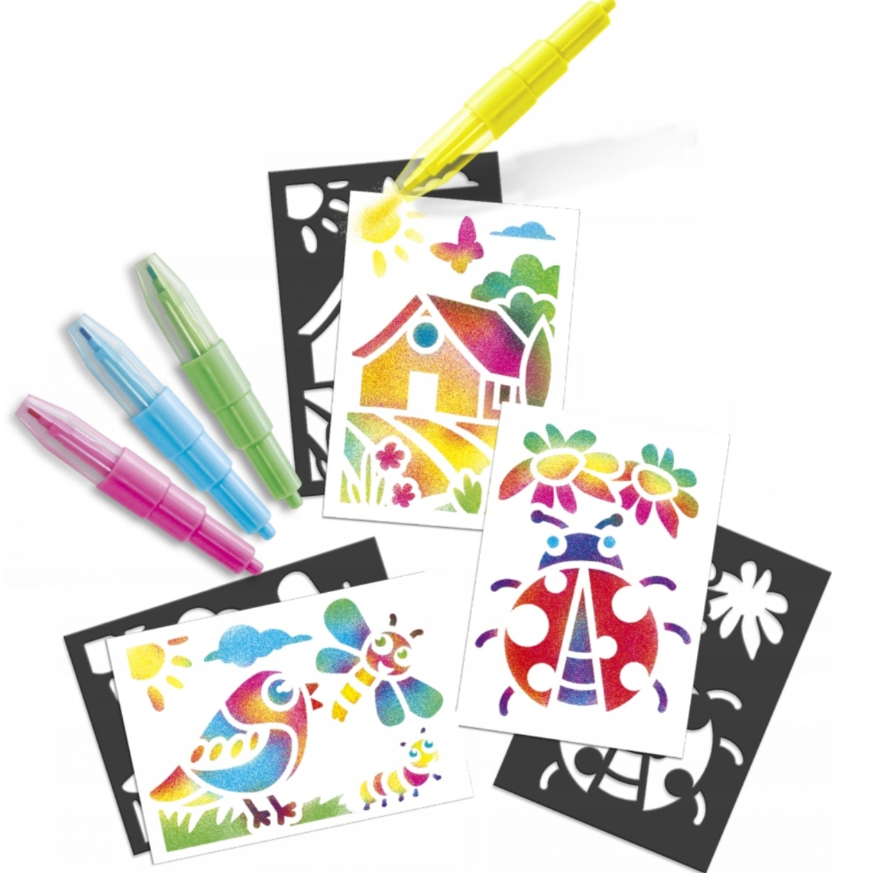 Prezentujemy nowość od firmy Lansay! Zestaw kreatywny złożony z 4 mazaków, doskonale sprawdzi się dla każdego fana artystycznych wizji. Dołączone mazaki są niesamowicie intrygujące- aby prawidłowo je użyć powinieneś w nie dmuchnąć. Nałóż szablon, dmuchnij w pióro i zobacz, jak pojawia się Twoje zdjęcie z efektami aerografu! Zestaw zawiera nowe szablony z uroczymi wzorami. Puść wodze fantacji i stwórz niesamowite obrazy!