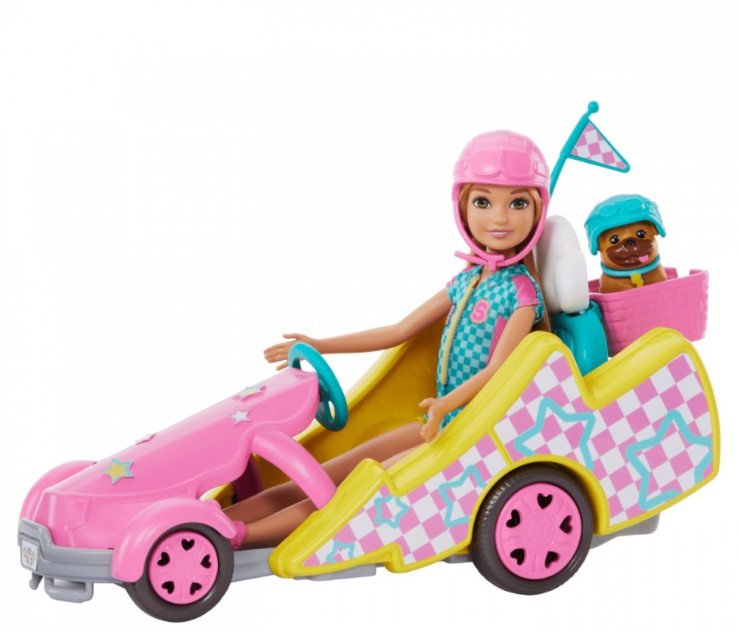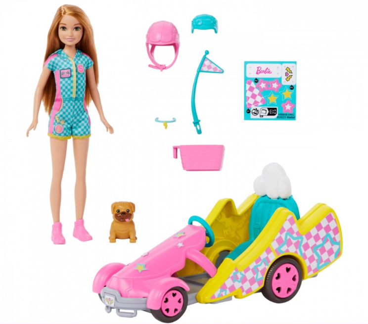 Zawartość zestawu: lalka Stacie, gokart, piesek, 2 kaski, koszyk, flaga, arkusz naklejek.