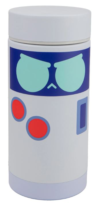 Butelka termiczna 8-Bit jest szaro-granatowego koloru z błękitnymi oczami i czerwonymi przyciskami na swojej powierzchni. Butelka wykonana została z materiału, który przez kilka godzin może utrzymać odpowiednią temperaturę napoju.