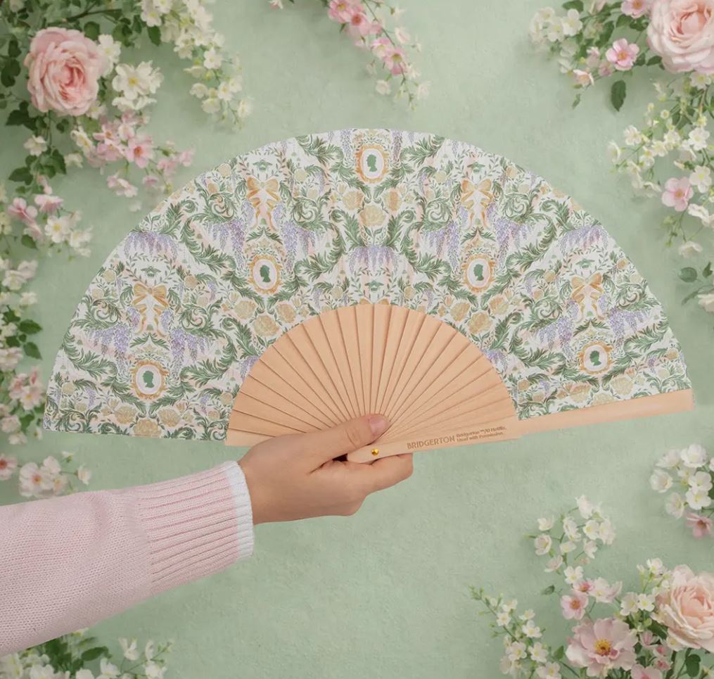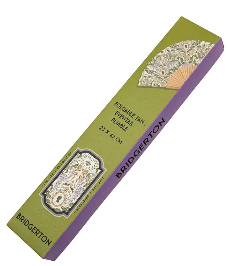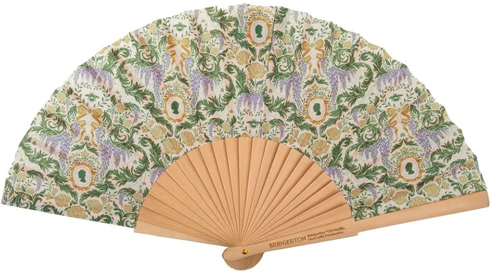 Chcesz poczuć się jak dama, należąca do londyńskiej socjety? Czas zaopatrzyć się w wyjątkowy wachlarz, stanowiący nieodzowny element codziennej stylizacji wielu dam znanych z serialu Bridgerton! Akcesorium wygląda dokładnie jak modele widziane w legendarnej produkcji - wykonany jest z drewnianej sklejki i delikatnego materiału ozdobionego nadrukami kwiatów, liści i ulubionego popiersia kobiety znanego z broszur Lady Whistledown. Wachlarz jest oczywiście składany, więc zmieści się w torebce.