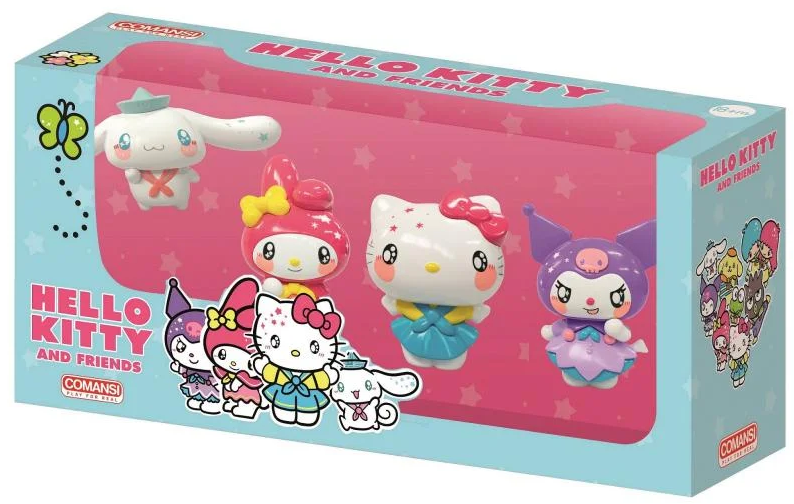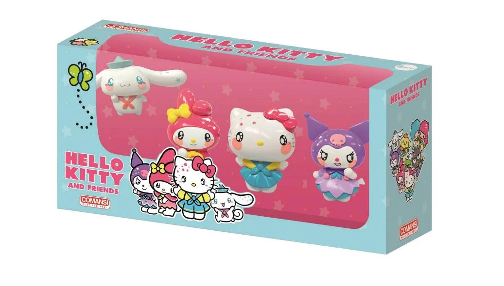 Zestaw zawiera figurkę Hello Kitty, Cinnamoroll, Kuromi oraz My Melody. Figurki wysokie są na ok. 5 cm.