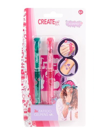 Stwórz fantastyczny, zmywalny tatuaż, wraz z najnowszym zestawem Create It! Do Twojej dyspozycji będą trzy barwne długopisy, którymi można bezpiecznie malować po skórze:zielony, fioletowy oraz szary. Możesz przy ich użyciu namalować dowolny wzór, lub skorzystać z dołączonych do zestawu szablonów, dzięki którym wykonasz gwiazdki, zygzaki czy serduszka. Aby zmyć tusz, wystarczy użyć wody z mydłem.