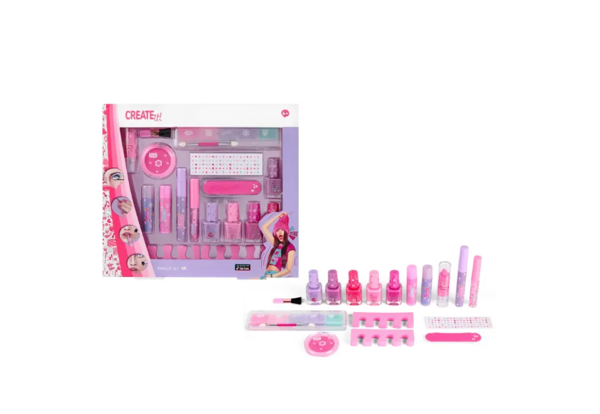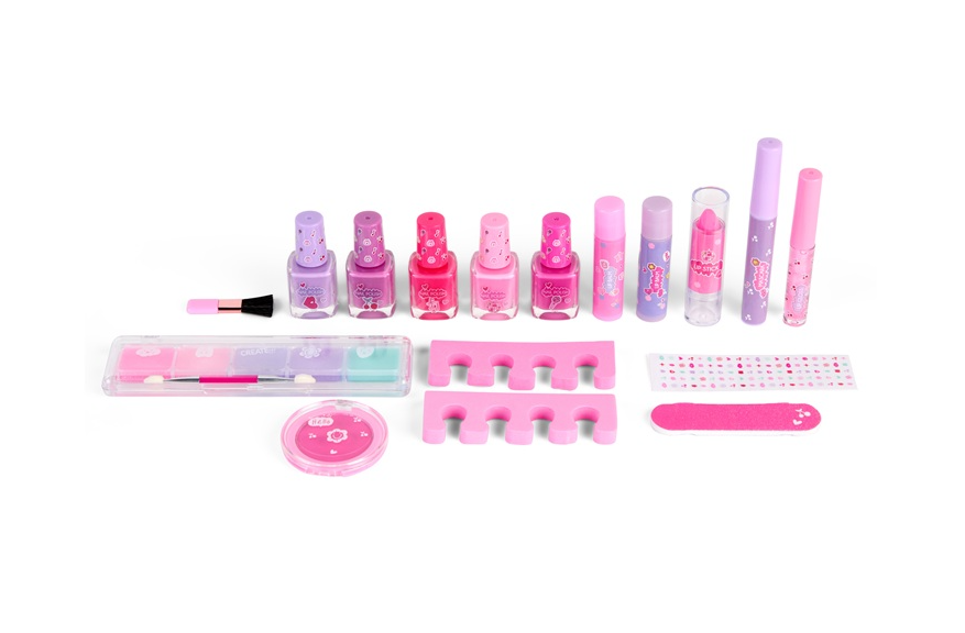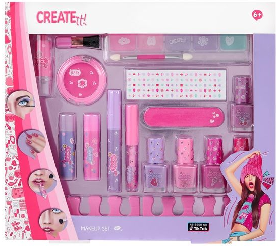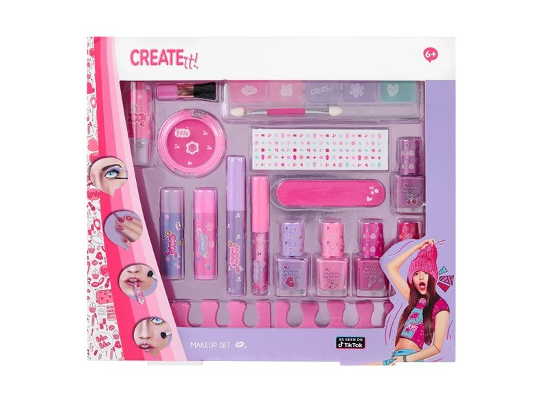 Dziewczynki uwielbiają modę, której makijaż jest wspaniałym dopełnieniem - korzystanie z kolorowych kosmetyków rozwija jednak kreatywność oraz pomysłowość. Opakowanie Create It! zawiera wszystko, co niezbędne do wykonania w pełni profesjonalnego makijażu i kolorowego manicure: pięć lakierów do paznokci, dwa separatory, błyszczyki z brokatem, szminkę zmieniającą kolor, tusz do rzęs, pilniczek oraz zestaw pięciu cieni w soczystych kolorach! Każdy z produktów jest w pełni bezpieczny, a dziewczynki korzystające z kosmetyków Create It! będą mogły pochwalić się wspaniałym make-upem.