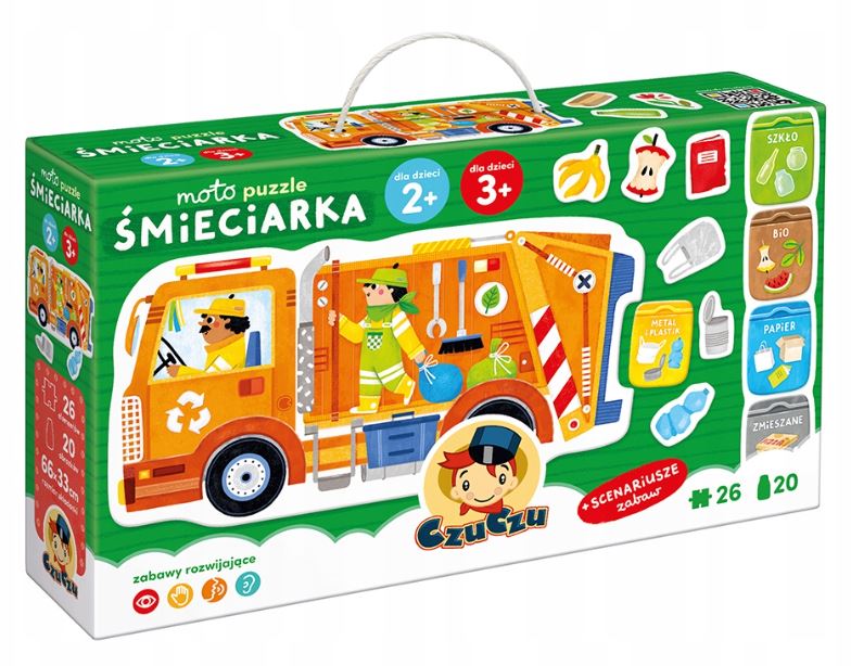 Przedstawiamy zestaw z serii Moto puzzle "Śmieciarka" od marki CzuCzu. Edukacyjne puzzle to doskonały pomysł na piękny i mądry prezent dla ciekawego świata przedszkolaka. Zestaw zawiera 26-elementowe puzzle, 20 dodatkowych obrazków oraz scenariusze zabaw. Puzzle dzięki swojej tematyce dodatkowo uczą maluchy prawidłowego segregowania odpadów.
