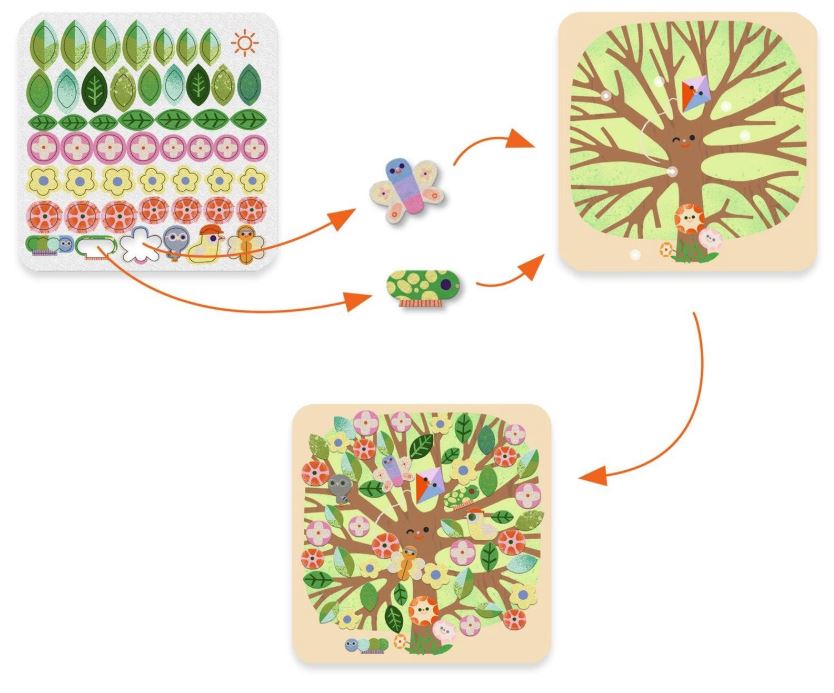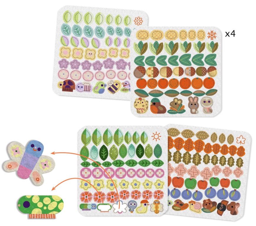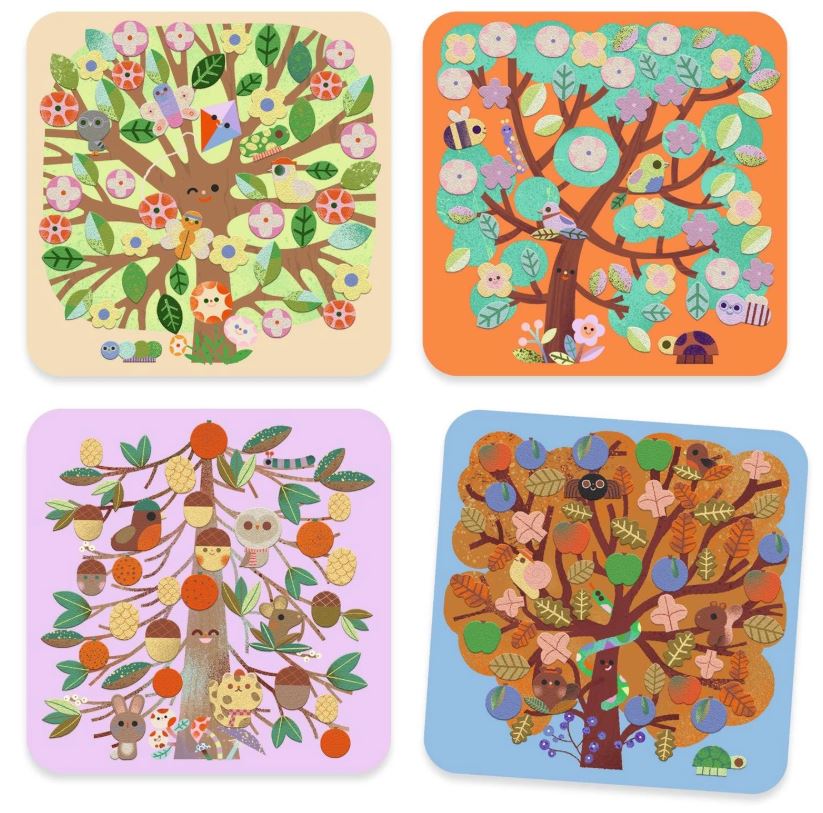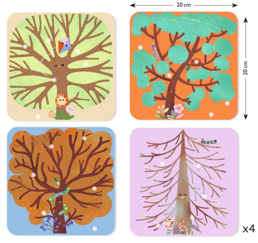 Wyklejanki filcowe DRZEWA marki Djeco to fantastyczny zestaw artystyczny dla dzieci w wieku od 3 do 6 lat. W zestawie znajdują 4 ilustracje, przedstawiające drzewa w różne scenerii. Zadaniem dziecka jest udekorowanie drzew filcowymi naklejkami, które przedstawiają kolorowe liście, kwiatuszki, zwierzątka i owoce. W zestawie jest 200 takich naklejek. Wymiary wszystkich ilustracji to 20 cm x 20 cm.