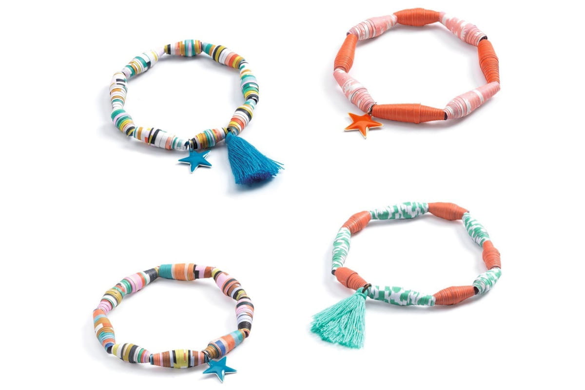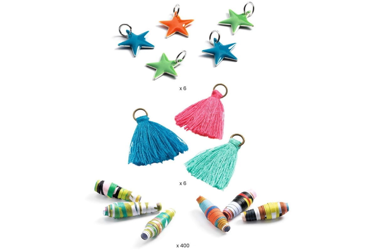 Kreatywny zestaw francuskiej marki zabawek Djeco umożliwi wykonanie samodzielnie bransoletek oraz elementów do nich. Zestaw składa się z 20. kolorowych kartek, 6. patyczków, 6 elastycznych wstążek, 6 zawieszek w kształcie gwiazdek, 6 pomponów, klej w sztyfcie oraz instrukcję.