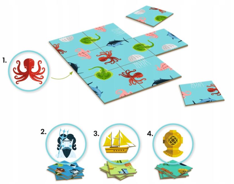 Producent zabawek Djeco prezentuje genialną grę logiczną. Produkty tej marki charakteryzują się unikatowymi grafikami, które zapraszają dzieci do świetnej zabawy. Gra logiczna Sologic IMPOSSIBLO OCEAN to ekscytująca zabawa, gdzie czeka podwodny świat! Zadaniem jest ułożeniu 4 kwadratów o wymiarach 9 x 9 puzzli. Na każdym elemencie znajdują się obrazki, które należy połączyć w całość, podobnie jak w grze "domino". Niedokończone pozostaną tylko te przedmioty, które znajdą się na krawędziach obrazka.