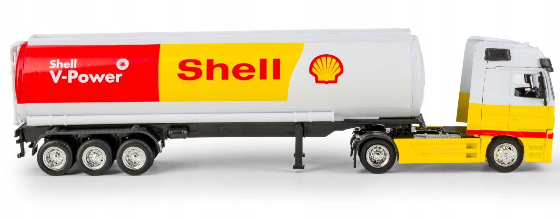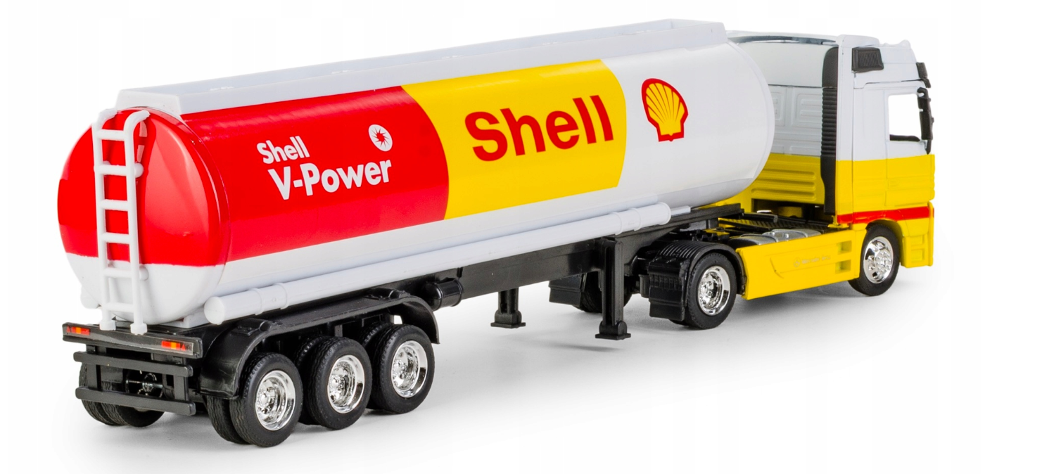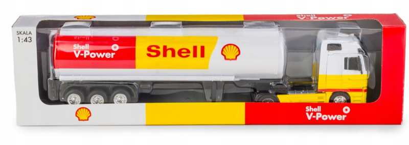 Cysterna Paliwowa Shell V-Power to model ciężarówki firmy Daffi. Model został bardzo szczegółowo odwzorowany i doskonale sprawdzi się dla wszystkich małych i dużych miłośników motoryzacji. Auto w skali 1:43 ma żółto-białą karoserię, a na dużej naczepie widnieje logo firmy.
