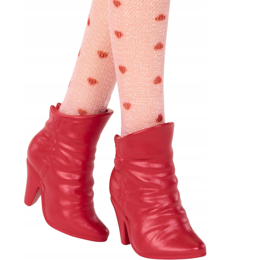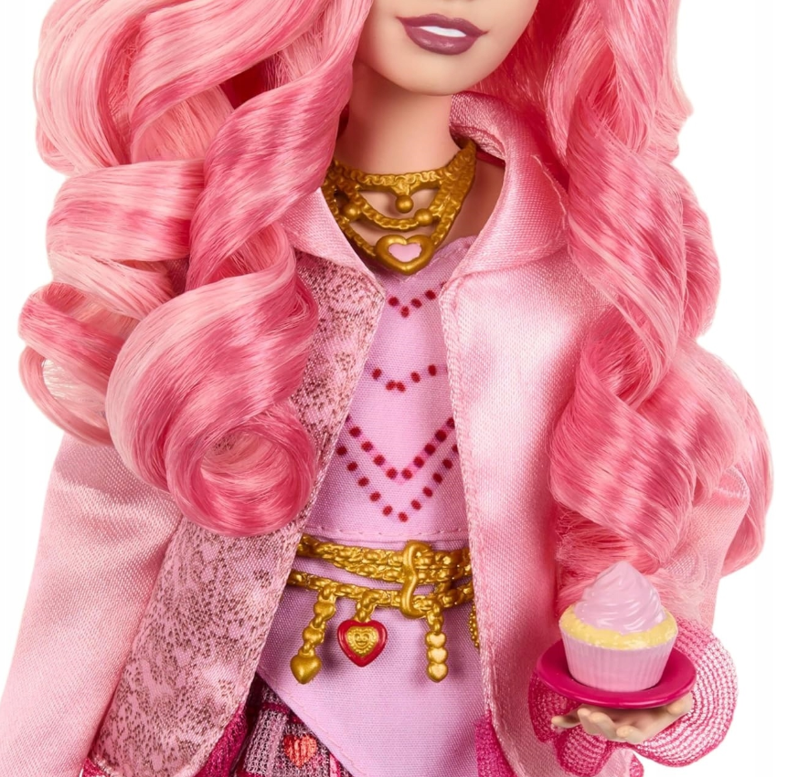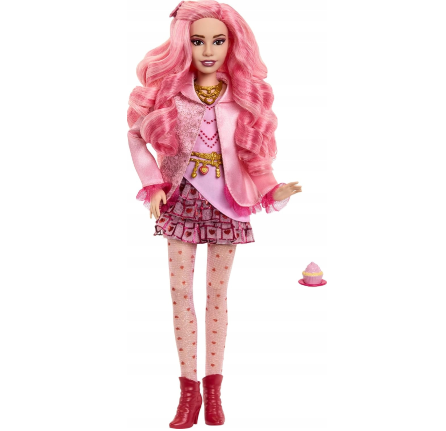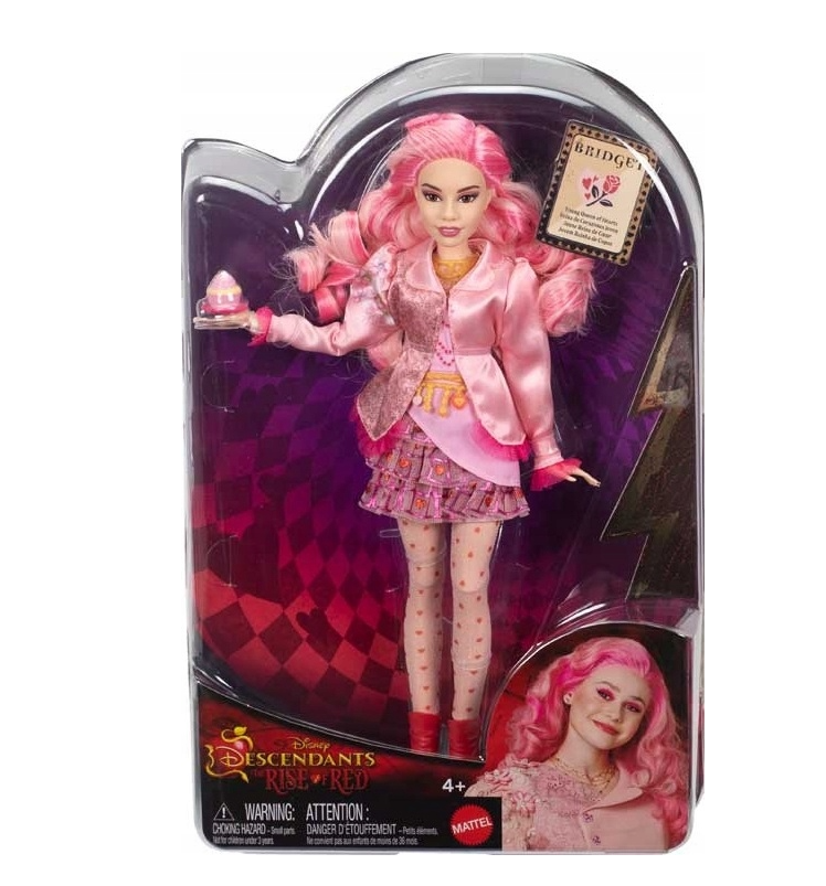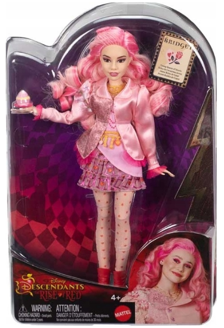 Bohaterka Bridget z najnowszego serialu dla dziewczynek od Disneya, znana jest jako Młoda Królowa Kier! Jej piękne, falowane włosy mają intensywnie różowy kolor. Lalka ma ruchome nogi, ręce i głowę. Ubrana jest w klasyczny strój, różowe rajstopy i botki na obcasie. W zestawie znajduje się również słodka babeczka.