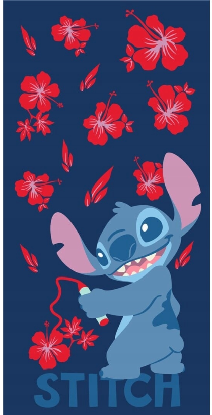 Uroczy ręcznik plażowy ze Stitchem to akcesorium, które idealnie sprawdzi się podczas wyjazdu na plażę lub basen. Ręcznik ma gramatowy kolor i ozdobiony został dużym wizerunkiem Stitcha wśród czerwone kwiatów.