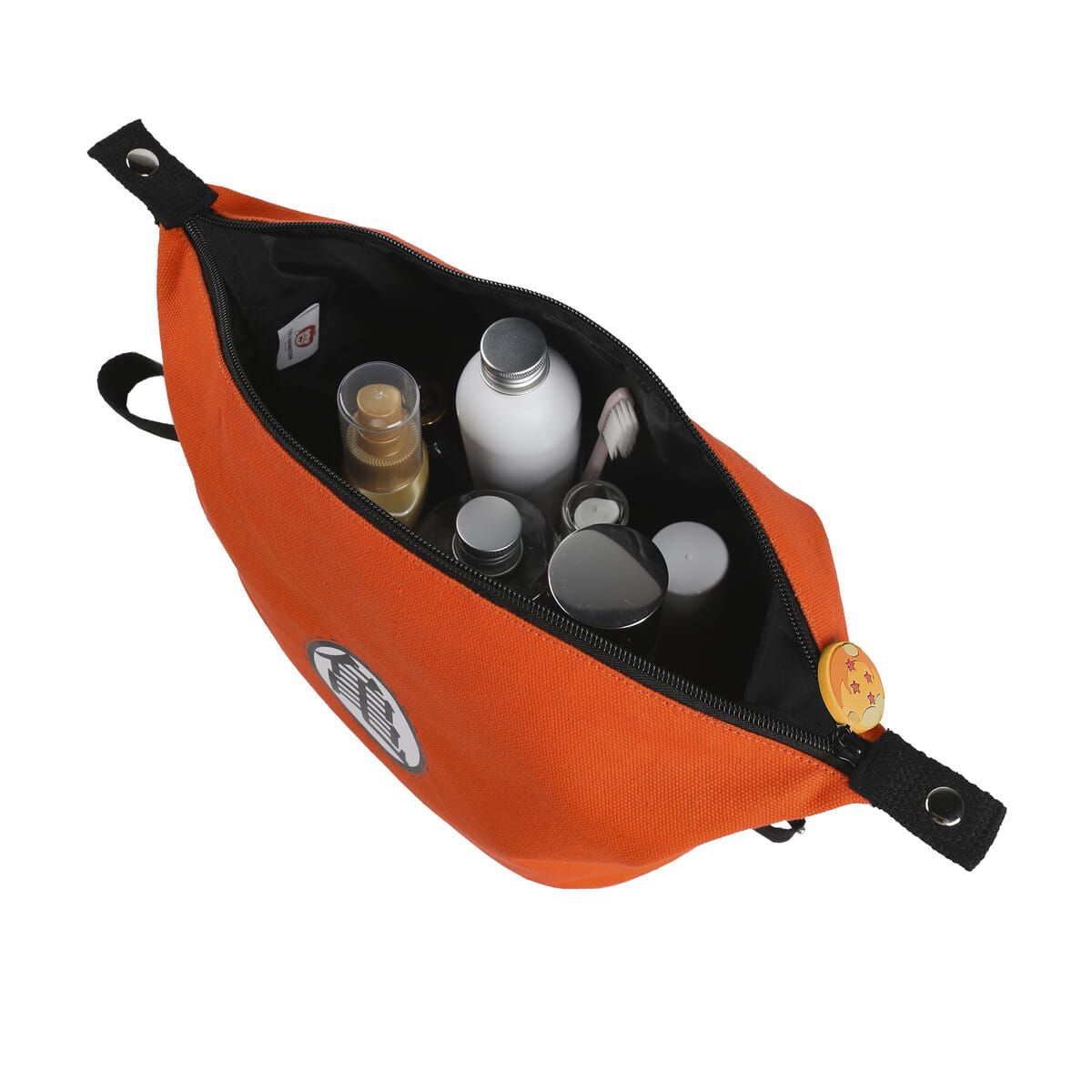 Kosmetyczka Goku to idealna propozycja akcesorium dla fanów popularnej serii magii i anime Dragon Ball. Kosmetyczka posiada jedną większą komorę, zamykaną na zamek błyskawiczny w pomarańczowym kolorze, z czarnymi i białymi elementami. Posłuży idealnie w podróży, przechowując najpotrzebniejsze kosmetyki lub inne przedmioty. Dodatkowo kosmetyczka posiada z jednej strony pasek, który można założyć na rękę. Produkt wykonany został z materiałów wysokiej jakości. Wymiary kosmetyczki: 25 cm x 15 cm x 13 cm.