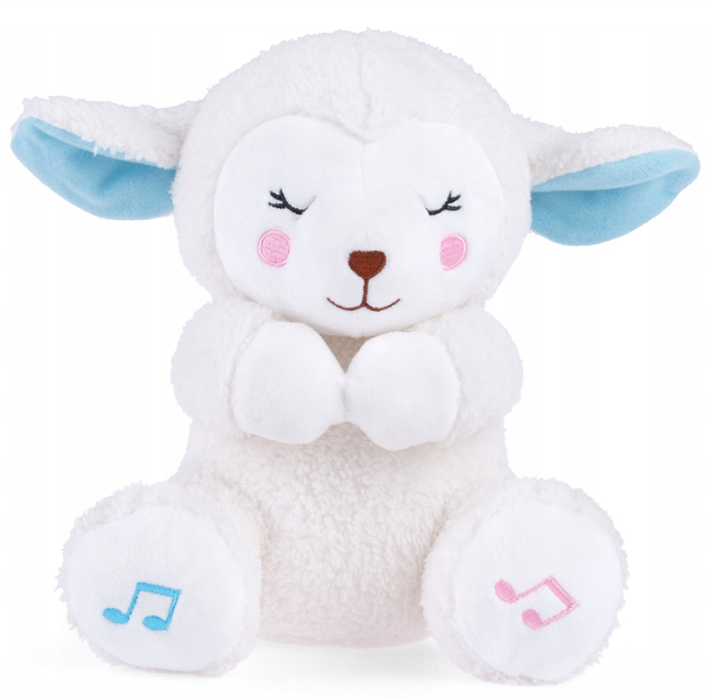 Ta urocza Owieczka pomoże maluchowi poznać pierwsze modlitwy – „Ojcze Nasz” i „Aniele Boży” – a gdy nadejdzie czas snu, utuli dziecko do snu delikatnymi kołysankami. Dźwięki aktywuje się, naciskając na łapki pluszaka: niebieska nutka uruchamia modlitwy, a różowa – melodie. Aby zatrzymać dźwięk, wystarczy ponownie nacisnąć tę samą łapkę. Owieczka wykonana jest z miękkich materiałów o różnych fakturach, które rozwijają zmysł dotyku i ciekawość maluszka, a jej wesoło szeleszczące uszka zapewniają dodatkową sensoryczną zabawę.