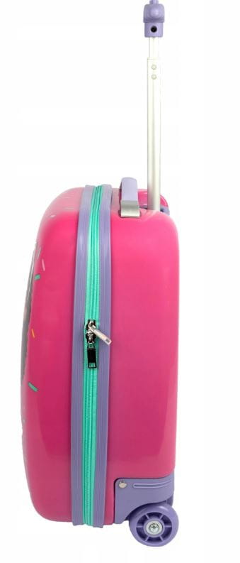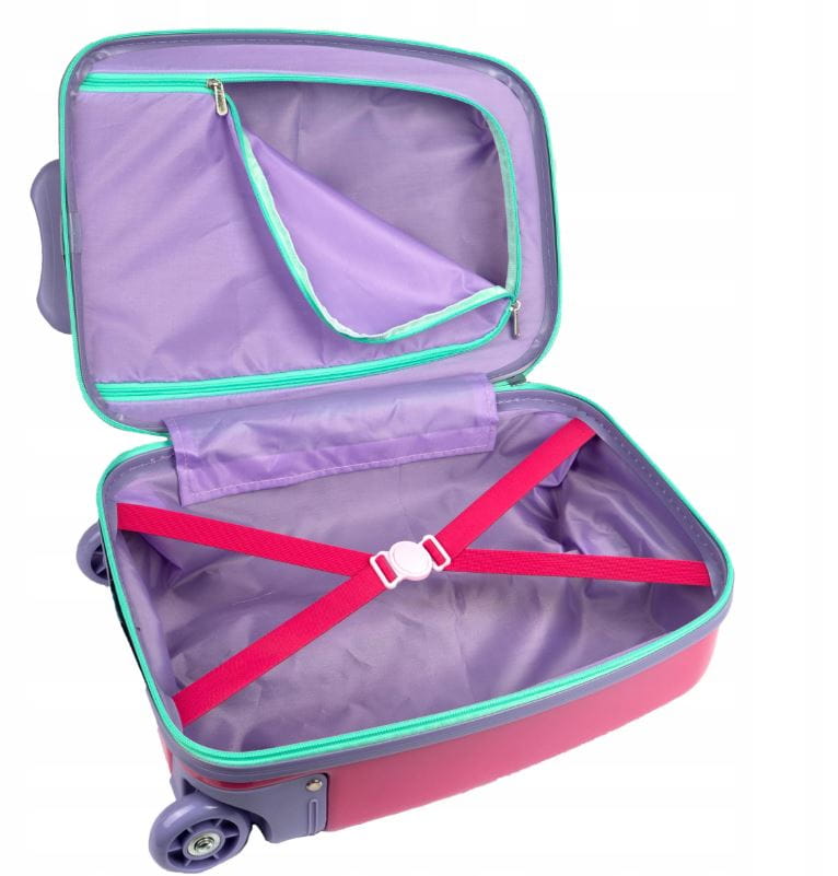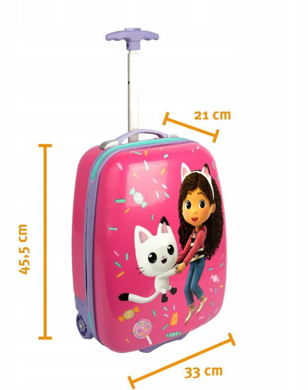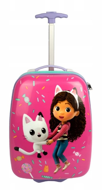 Walizka z motywem Kociego Domku Gabi z wytrzymałego tworzywa doskonale się sprawdzi w trakcie podróży samochodem czy samolotem! Na przedniej części znajduje się grafika jak zawsze uroczej Gabi ze swoim wiernym przyjacielem Kiciusiem. Walizka jest różowego koloru z wyciąganą rączką. Wnętrze zostało podzielone na dwie komory- jedna zamykany jest w całości na zamek, natomiast drugą ma specjalne gumowe zapięcia (charakterystyczne dla standardowych walizek).