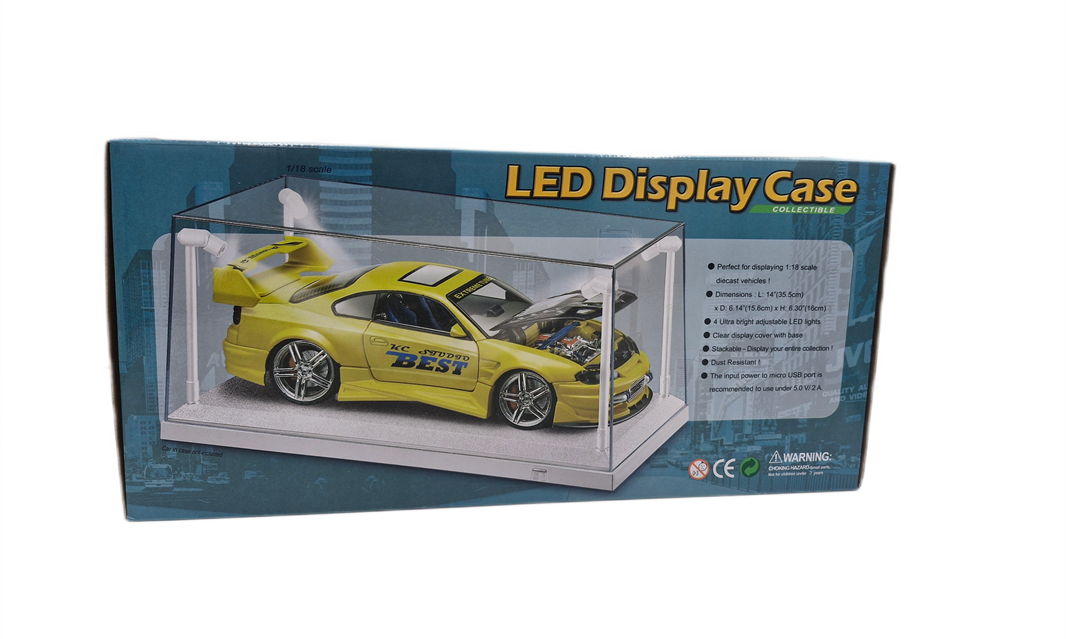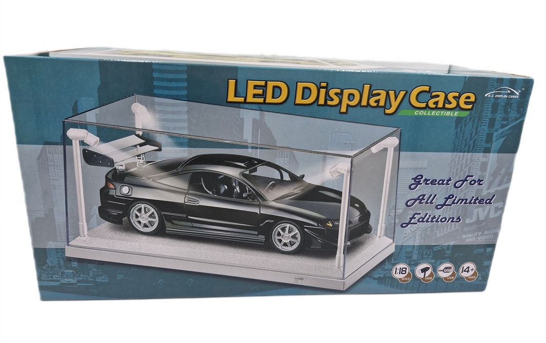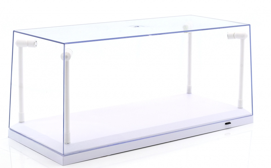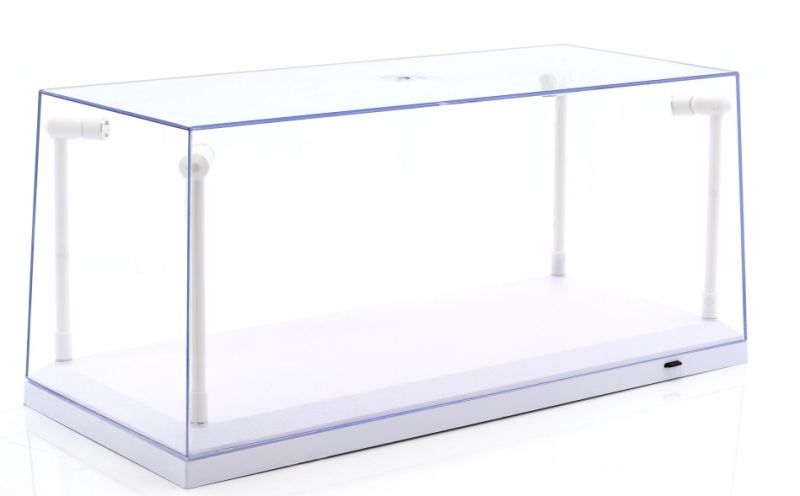 Gablotka w skali 1:18 pozwoli na jeszcze lepsze wyeksponowanie ulubionego modelu, który trafił do naszej kolekcji. Pojemnik ma białą podstawę oraz transparentne ścianki, dzięki czemu umieszczony wewnątrz przedmiot można podziwiać dosłownie z każdej strony. Dodatkowym atutem jest regulowane oświetlenie LED, które sprawia że prezentowane modele wyglądają jeszcze bardziej zjawiskowo. W gablotce znajdują się 4 lampy LED, które mogą być zasilane 4 bateriami AA lub za pomocą kabla Micro USB. Gablotka posiada wymiary 35,5 cm x 15,6 cm x 16 cm.