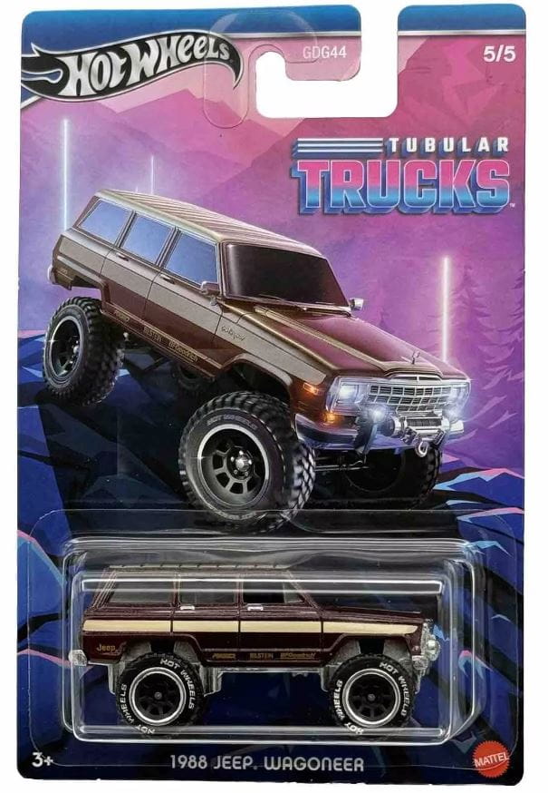 Pojazd 1988 Jeep Wagoneer z linii Hot Wheels to model pojazdu wykonany w skali 1:64, który bardzo szczegółowo oddaje wygląd terenowego auta - ma bardzo wysokie zawieszenie, terenowe opony, brązowa karoseria z kolorowymi elementami dodatkowymi.