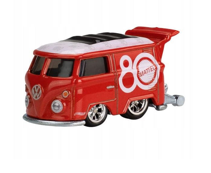 Metalowy samochodzik, stanowiący wierną replikę pojazdu Kool Kombi, w intensywnym, czerwonym kolorze z linii Hot Wheels Premium - Pop Culture.