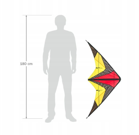 Wymiary latawca wynoszą 135 cm x 60 cm. W zestawie linka 2 x 25 m na szpuli. Latawiec dedykowany jest dzieciom od 8. roku życia.